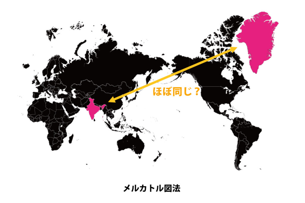 メルカトル図法で見ると、北極近くにあるグリーランドは、かなり大きく表現されていますが、実際の面積で見ると意外と小さいのです。大きさはインドと同じくらいです。